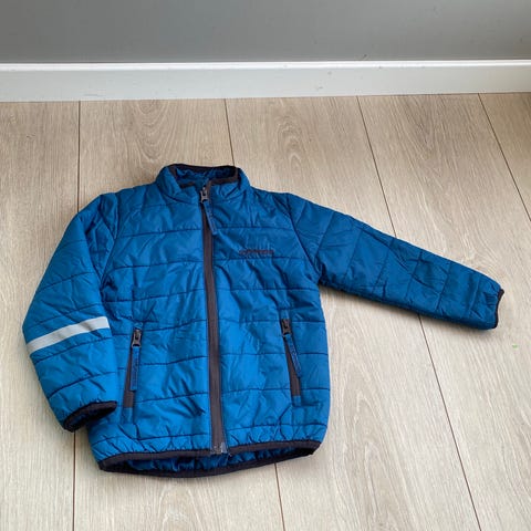 Pent brukt dunjakke størrelse 98, passer fra 2-4 år. Veldig god jakke som vi har likt godt. Vasket på dunprogram og tromlet etter vaskeanvisning. Se bildene for detaljer og tilstand.