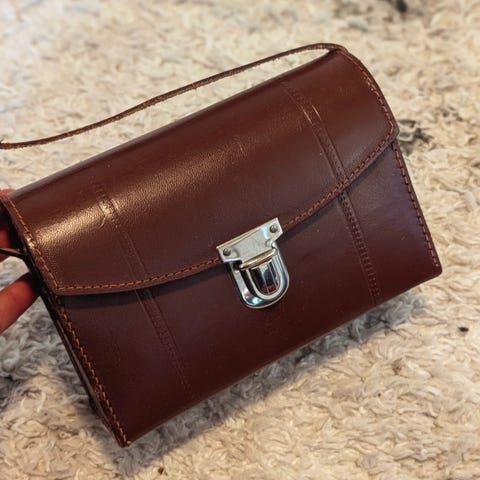 Selger en vakker, håndlaget vintage skinnveske i dyp brun farge. Vesken har et klassisk design med solid søm og en elegant sølvfarget lås.