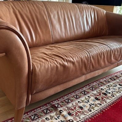 3- seteren har litt slitasje i skinnet, se bilder. Ellers er møblene i god stand. Meget komfortable å sitte i. Normale bruksmerker forekommer.