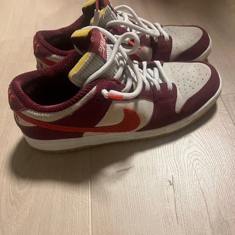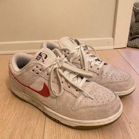Nike Dunk Low SE 85 Double Swoosh Sail Orange. Skoene er hvite med røde detaljer og laget i skinnmateriale. Egnet for hverdagsbruk.