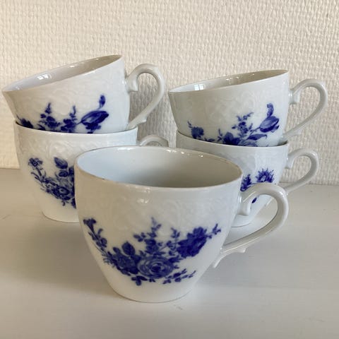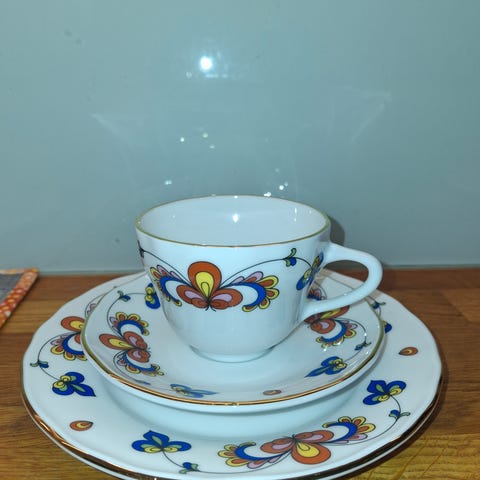 Kopp: 6 cm høy, 7,5 cm ø, fat: 12,9 cm ø, asjett: 19,8 cm ø
