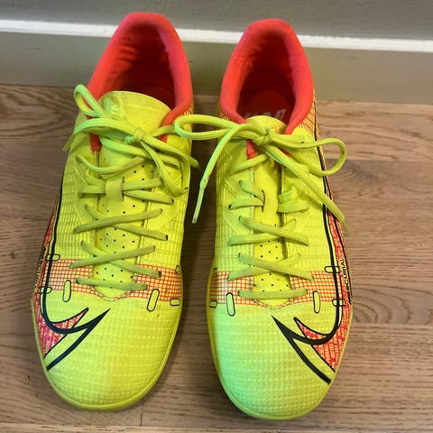 Nike fotballsko for innendørs bruk i blå og gul farge. Skoene har gummisåle og er i størrelse 42.5 Designet for å gi godt grep og komfort på innendørs underlag. Brukt cirka 4-5 ganger
