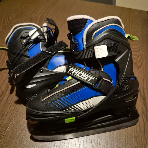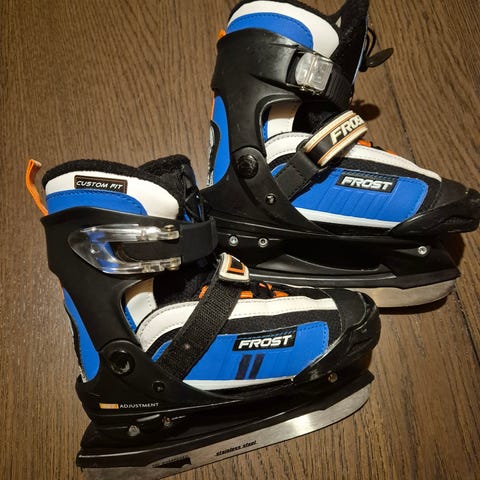 Marlee Ice Ishockey Skøyter for barn, justerbare størrelse 29-34. Skøytene har blå og hvit farge og er designet for ishockey. De har justerbar lukking med borrelås og snøring for god passform og støtte. Passer for jenter.