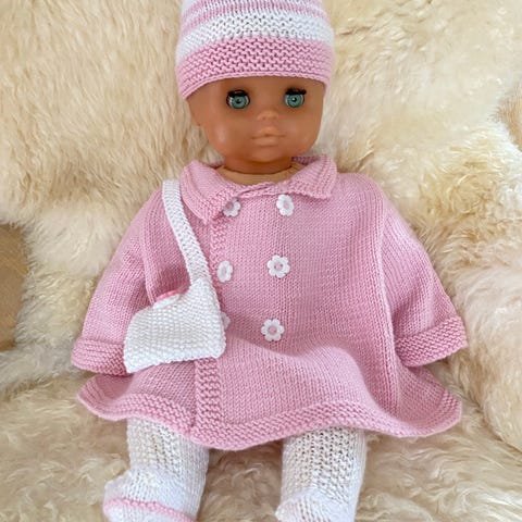 Baby Born dukke klær som inkluderer et strikket sett med jakke, bukser og lue i rosa, samt en svart kjole med røde og grønne striper og en hvit sjal. Materialet er strikket garn. Passer til Baby Born dukker.