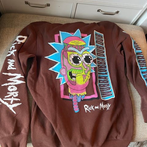 H&M Rick and Morty langermet T-skjorte i størrelse M. Fargen er grå, og plagget har trykk med karakterer fra Rick and Morty på brystet og på ermet. Laget for menn.