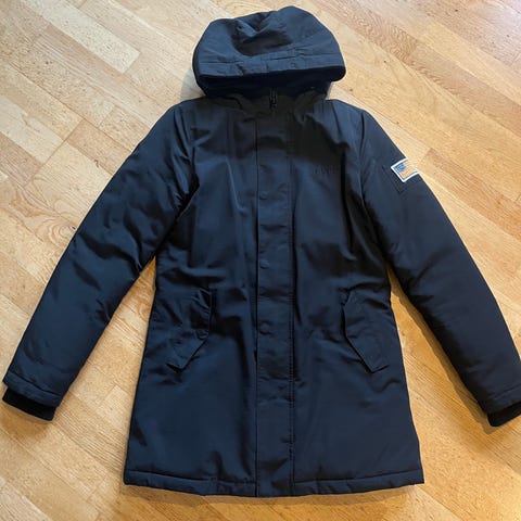 Svea yttertøy for kvinner i størrelse M. Jakken er svart med hette og har en pelskant rundt hetten. Den er designet for utendørs bruk og har en lengde som dekker til midten av låret.