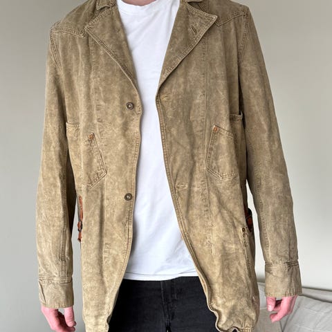 Vintage jakke i semsket skinn selges. Kommer fra Alf Hallen A/S. Størrelse 48 (medium). Noen bruksmerker. Stammer fra 70-tallet. Kr 1700,-.