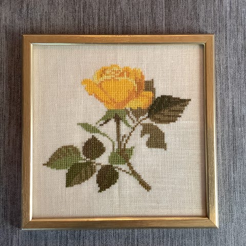Bildet er laget på stoff av lin med korsstingteknikk og er innrammet i en enkel, gyllen ramme.