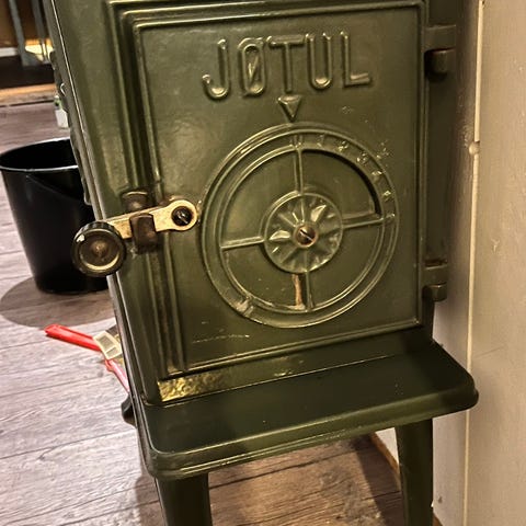 Jøtul vedovn i støpejern med dør og håndtak i metall. Ovnen er grøn og har en rektangulær form med ben for plassering på gulv. Egnet for oppvarming av rom ved bruk av ved som brensel. Pris for begge men kan selges separert. Kom med bud