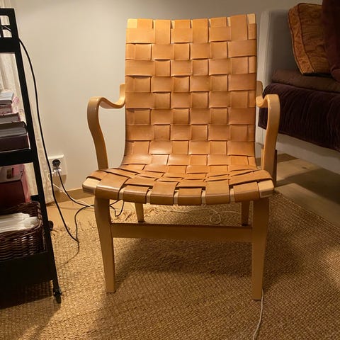 Bruno Mathsson “easy chair” Ingrid lenestol med fotskammel, laget av lær og tre. Lenestolen har polstret sete og rygg med knappdetaljer, samt trearmstøtter.