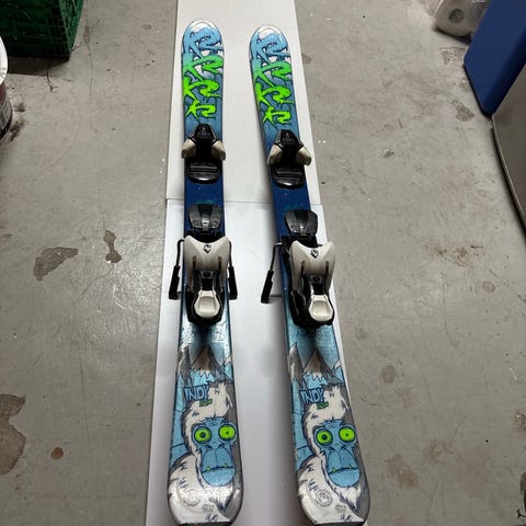 K2 alpinski med integrerte bindinger. Skiens lengde er 139 cm. Fargene er hovedsakelig hvit og svart med grafiske detaljer.