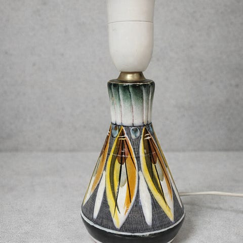 Keramikk og glasur er i god stand, men lampen trenger nok ny ledning og sokkel til pære, og skjerm. Kan selvfølgelig brukes som den er nå.