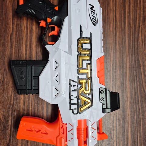 Nerf Ultra Blaster barn leker i hvit og oransje farge. Leveres med flere skumprosjektiler. Egnet for barn til lek og utendørs aktiviteter.