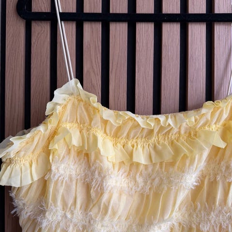 Oasis sommerkjole i gul farge, størrelse 14( jeg er 178 cm, den passer nok str 40-44) . Kjolen har korte ermer, og pen markering av midjen. Knelang. Glidelås og sløyfe på ryggen. Kjolen er fôret.