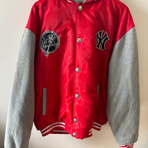 Vintage skinnjakke i ekte skinn med glidelås og krage, laget av New York Yankees, og originale merkelapper inni jakken.