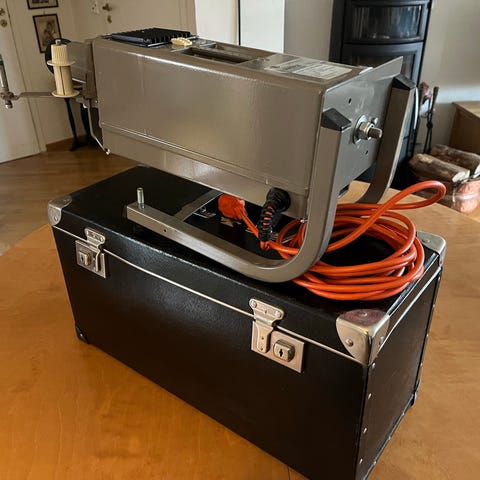 Kabinettet er montert i en robust koffert med hjul og håndtak for enkel transport.