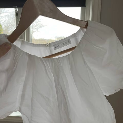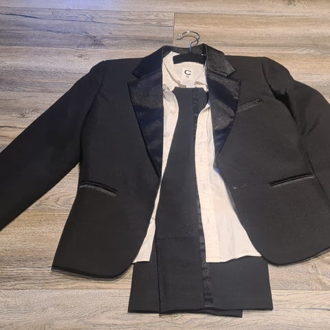 Buksen har litt slitasjemerker på knærne. Blazer og skjorte er i god stand.
