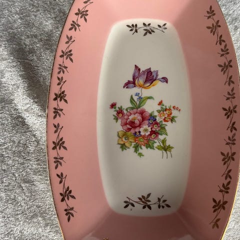 Det er 29 cm.langt og 17cm br.Nydelige blomster og kant rundt.Et lite ubetydelig nag under.
