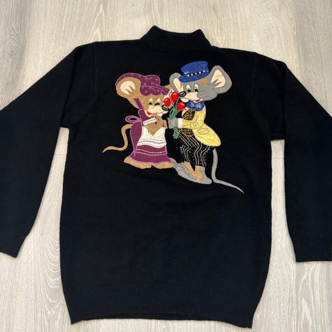 Vintage genser i oversize modell i ull og angora,. Den er i nydelig blålilla farge og har broderte motiver. Mål: Lengde ca. 66 cm, brystvidde ca. 105 cm.
