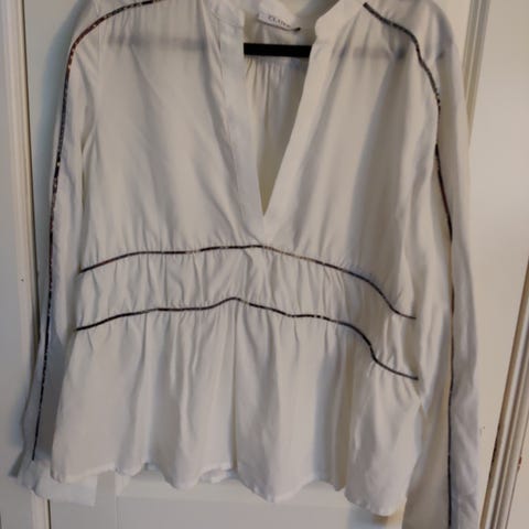 Meget pen bluse i høy kvalitet fra Claudia Strater i størrelse 40. Hvit med brunt mønster. Svært kledelig og feminint snitt.