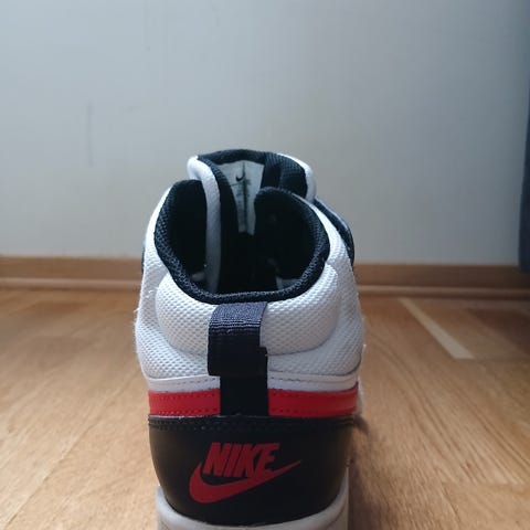 Nike Air Sneakers joggesko i størrelse 37. Fargen er svart og hvit med detaljer i svart og hvitt skinnmateriale. Skoene har borrelås og snøring for justerbar passform. Sålen er laget for demping og komfort ved bruk.