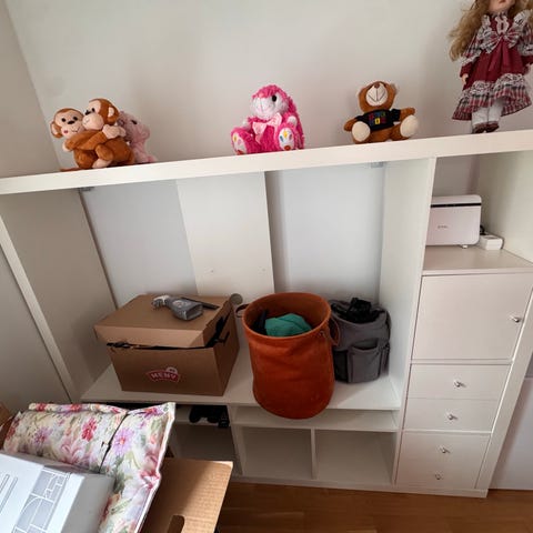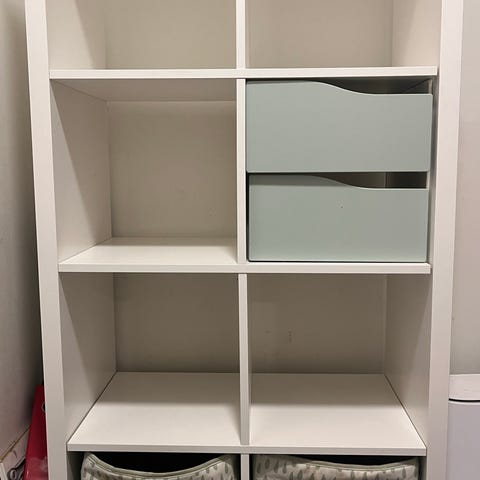 IKEA Eket oppbevaringshylle med flere rom i grå og hvit farge. Hylleenheten har treben i tremateriale og kombinerer funksjonalitet med et moderne design. Passer til organisering og oppbevaring i ulike rom.