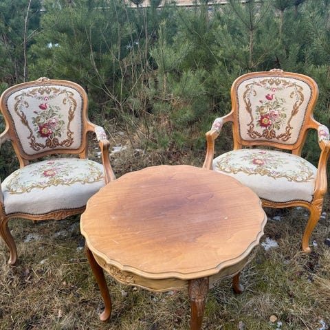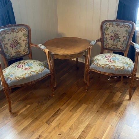 Antikk rundt spisebord laget av mørkt tre. Bordet har buede ben med dekorative detaljer og en glatt bordplate. To trestoler med broderier av eldre årgang. Passer til bruk i spisestue eller stue som et klassisk møbel.