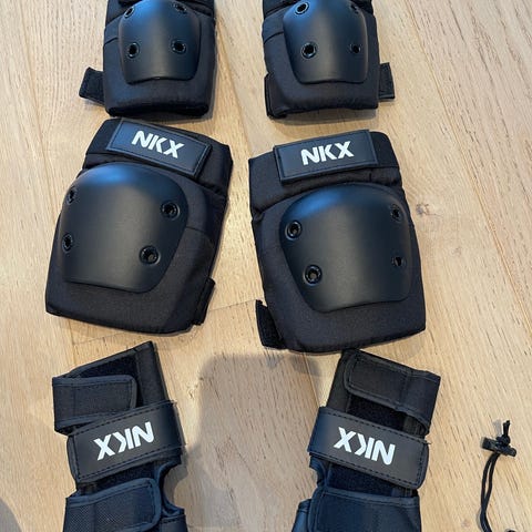 Reaction Beskyttelsesutstyr Sett med Albue- og Knebeskyttere i svart farge. Settet inkluderer polstrede beskyttelser for albuer og knær, designet for å gi beskyttelse under aktiviteter som sykling, skating eller lignende. Beskytterne har justerbare stropper for sikker og komfortabel passform.
