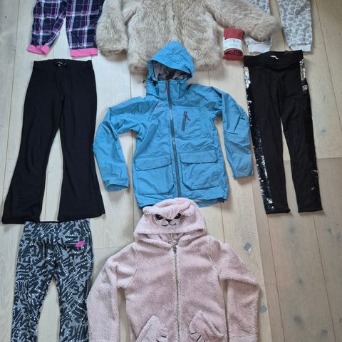 Hampton Repulic dressjakke str 140 og hettejakke i 146/152, vinterjakke uten hette, joggesko str.36, 5 par bukser(1xstr 134, 2×140,2×146/152, hjemmestrikket genser. Selges helst samlet 750,-