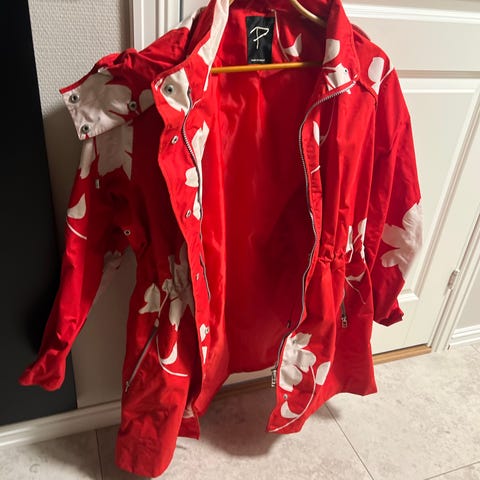 Denne regnkåpen er skikkelig laaaang slik at man slipper å bli våt nedover lårene. Kjempepraktisk men dessverre er det feil størrelse hvis ikke skulle jeg gjerne brukt den selv. Matchende sydvest følger med. Regnfrakken er helt ubrukt og nyvasket 😊