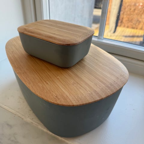 Selger 2 metallbokser fra Kremmerhuset. Den ene er en brødboks, de andre litt mindre som kan brukes til oppbevaring. Den grå boksen går ikke helt ned på høyre siden forfra, men har ingenting å si for bruk.