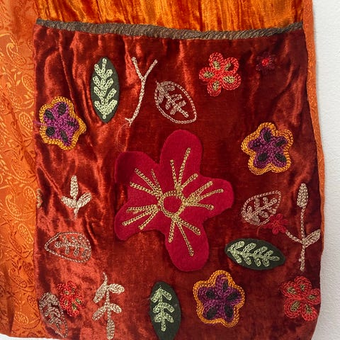 Farstad vest framside og bakside (begge h62xb90cm), sølvbånd (180cm) og linfor (h60xb140cm), selges samlet kr. 4800