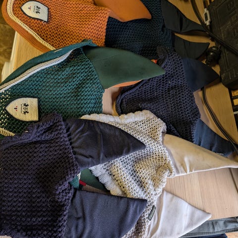 Ørehetter selges samlet hb 50 kr. Blå str full og hvit full/cob