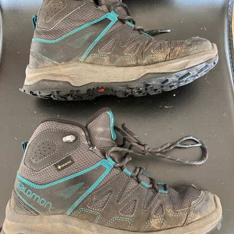 Gode tursko fra Salomon som går over ankelen. Mye bruk igjen. Str. 37 1/3. Grå med blågrønne detaljer.