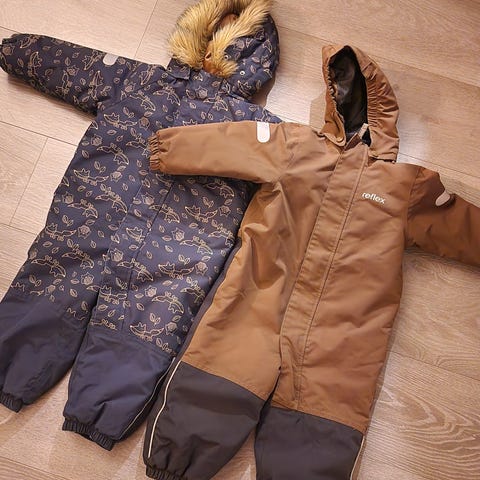 Vinterdress i størrelse 92, unisex. Overallen er svart med mønster og er laget for å tåle vann og vind, med pustende materiale.