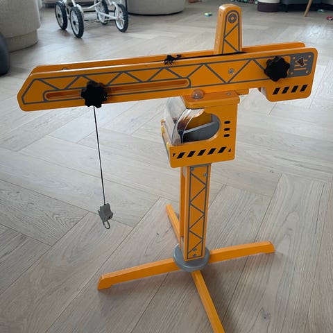 Heisekran laget i tre fra IKEA med bevegelig arm og flere fargerike klosser med magneter. Passer for barn og kan brukes til lek og utvikling av motoriske ferdigheter.