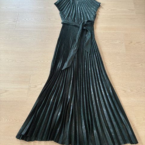 Groa festkjole i størrelse 36 for kvinner. Kjolen er grønn og har et mønster som gir et dekorativt uttrykk. Materialet er ikke spesifisert, men kjolen har korte ermer og en rett passform. Egnet for formelle eller festlige anledninger.