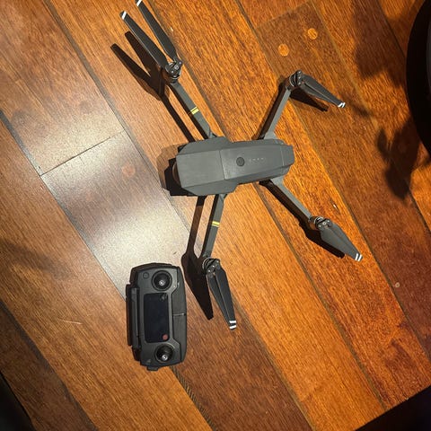 DJI Mavic Pro drone med foldbar design, utstyrt med kamera. Fargen er svart. Passer til luftfotografering og videoopptak. Kompakt og bærbar modell. Drone er lite brukt,men bare liget i skapp. Giro plutselig sluttet å fungere,mens den var i eske. Mangler et knapp på kontroller. (Aldri brukt den) Vedlikehold ladet bateri.