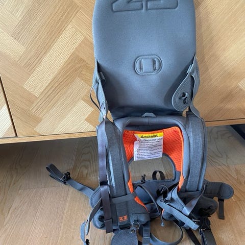Minimeis / Ergobaby bæresele i blå farge, justerbar størrelse, laget av slitesterkt materiale. Designet for å gi komfortabel bæring av barn for både menn og kvinner.