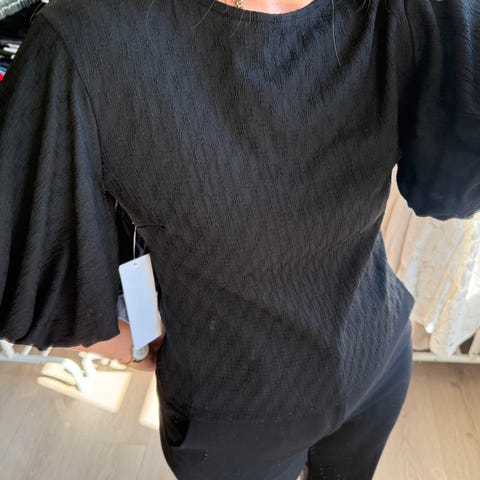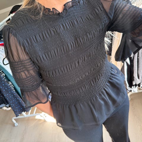 Bubbleroom Andre topper i størrelse XS for kvinner. Toppen er lilla og har en smocket overdel med lange, gjennomsiktige ermer. Materialet er lett og egnet til hverdagsbruk eller mer formelle anledninger.