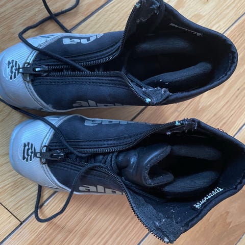 Alpina langrennssko i størrelse 28, med svart og sølv farge. Skoene har glidelås og snøring foran. Alt helt og pent brukt