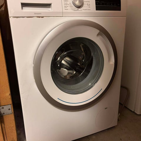 Samsung vaskemaskin selges. Produktet er hvitt og har frontåpning med dør som kan åpnes for enkel tilgang til maskinen. Designet for husholdningsbruk.