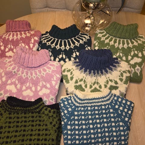 Nydelig håndstrikket genser i ullgarn, str tilsvarer medium.