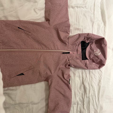 Pent brukt vindjakke. Lufting under armene og lomme på magen. Avtagbar hette.
