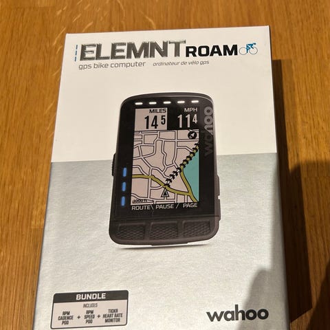 Wahoo ELEMNT Roam V2 sykkelcomputer med GPS-funksjon. Enheten har fargeskjerm som viser kart, hastighet, distanse og andre sykkelrelaterte data. Designet for montering på sykkelstyret og kompatibel med ulike sensorer for ytelsesmåling