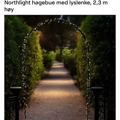 En lyslenke med 500 LED-pærer er viklet rundt den store buen. Lysbuen har et varmt skinn som lyser opp hagen, inngangspartiet eller lokalet på en elegant måte. Mål (B x H): 1,5 x 2,3 meter.