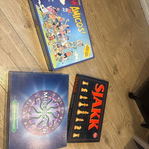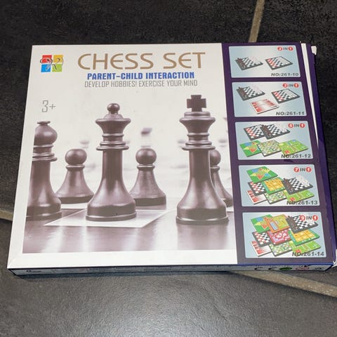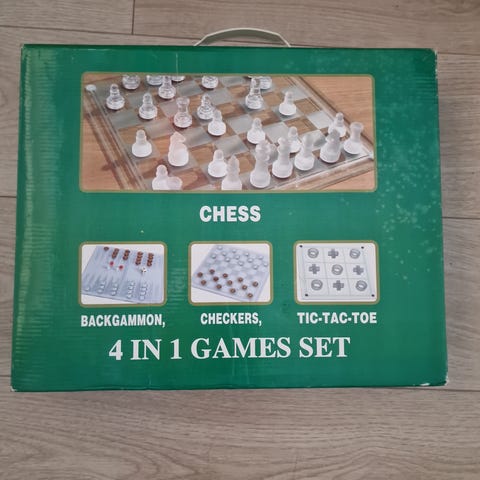 3 in 1 Game Set inneholder tre forskjellige spill: sjakk, backgammon og et kortspill. Spillet leveres i en boks med blå design. Materiale og størrelse er ikke spesifisert. Passer for ulike aldersgrupper og kan brukes til underholdning og spillaktiviteter hjemme.