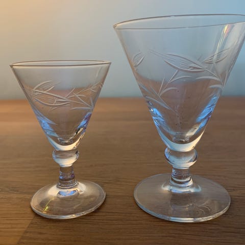 6 stk Viking glass med rød fot i meget god stand . Designet av Sverre Pettersen på 1930-tallet . Høyde 8,5 cm , diameter 6,3 cm .