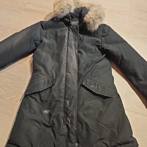 Pent brukt parka fra Woolrich i str S, navy blue. Ingen hull/bruksmarker.