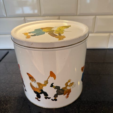 Er du lei av at ormeyngelet gnafser i seg julebaksten før den store dagen? - Gjem unna godsakene i denne raffe metallboksen overstrødd med stirrende kreaturer som garanterer sengevæting til godt utpå nyåret! Se selv hvordan avkommet rygger tilbake i umælende angst stilt overfor denne optiske migrenen av en kakeboks, og du har for siste gang gjennomlevet skammen og skuffelsen ved å kun ha smuler og melketenner å by dine prominente gjester i anledning Frelserens fødsel. 1:1 ratio høyde/diameter: 23cm.
